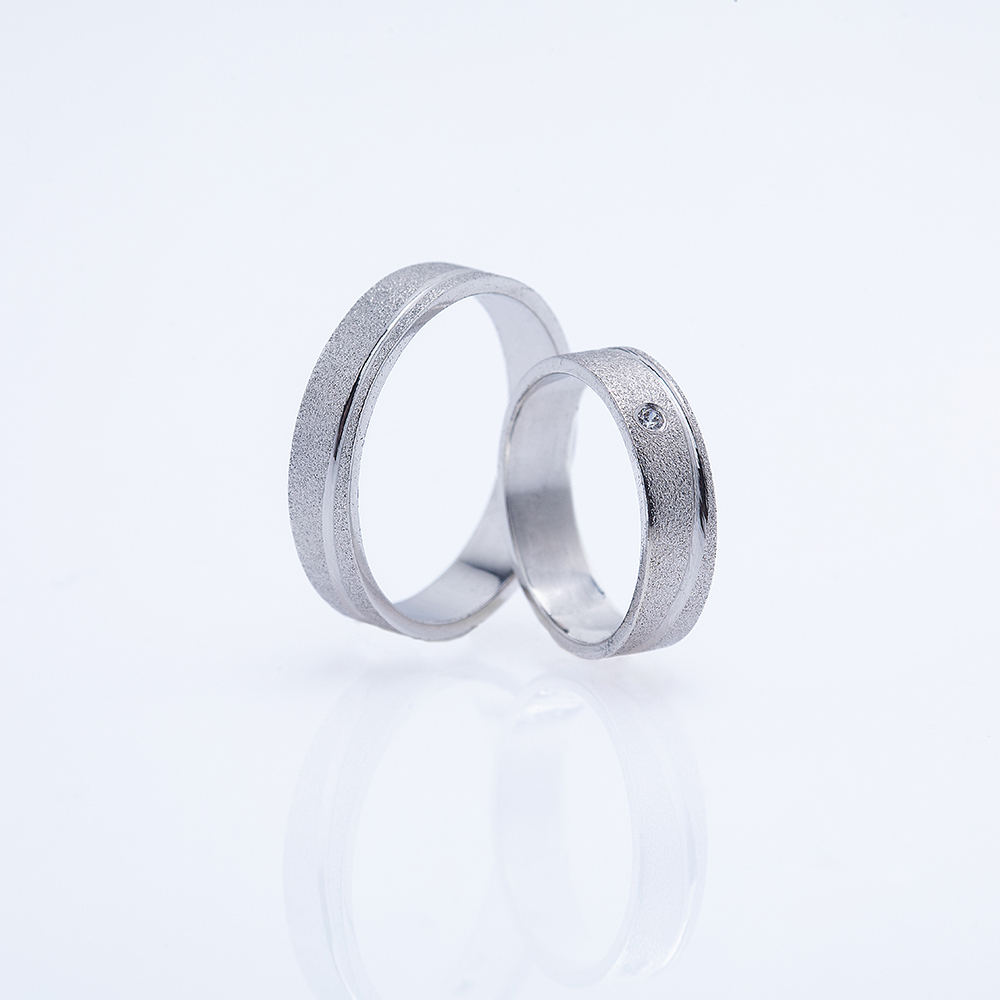 Burme od belog zlata sa peskiranom površinom, sjajnim ivicama i jednim kamenčićem na ženskoj.