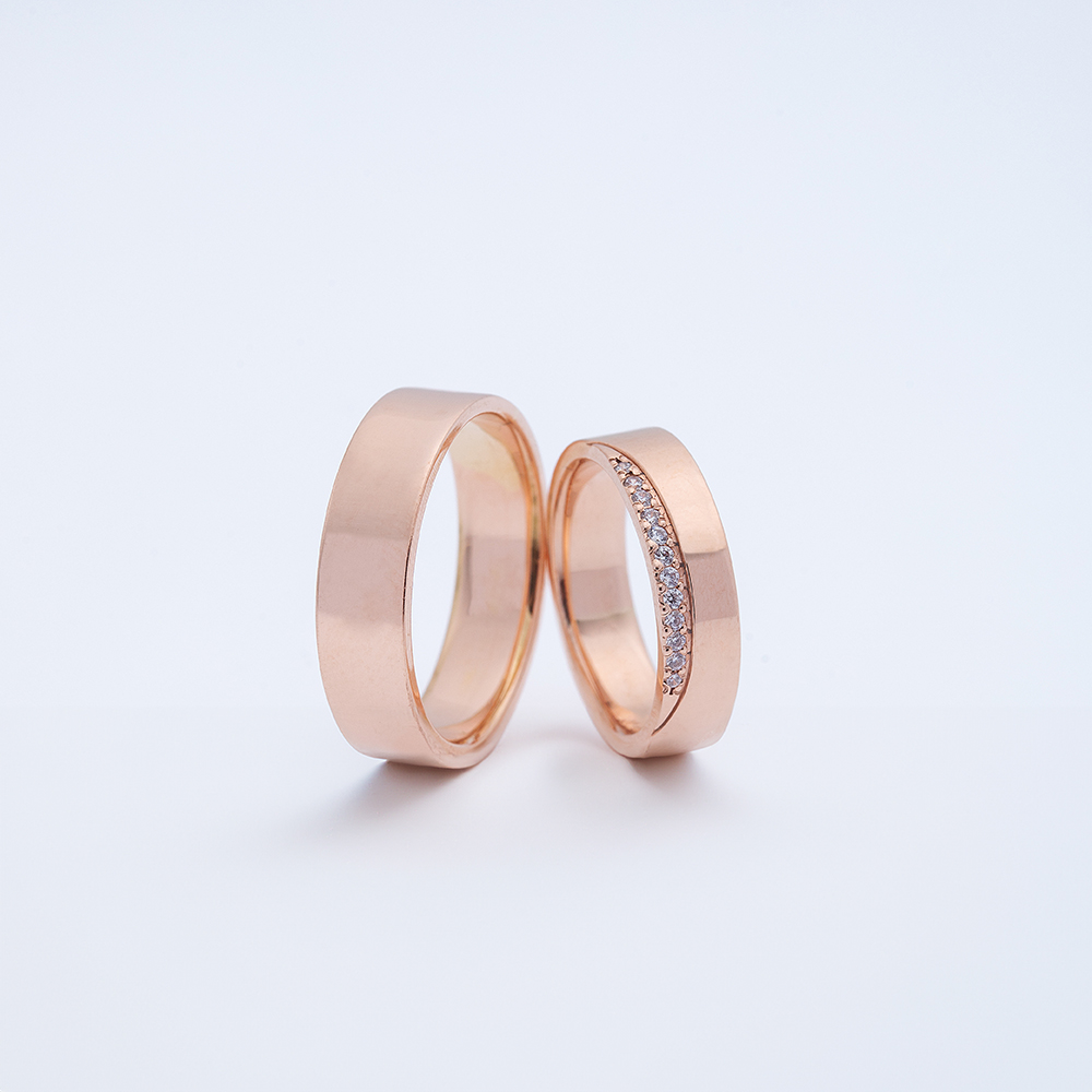 Roze zlato donosi toplinu i romantičan ton, a niz sitnih dijamanata duž urezane linije dodaje sjaj koji se prelepo presijava na svetlu.