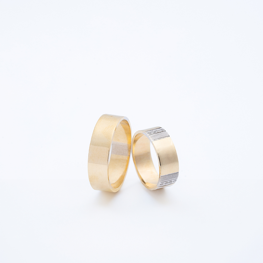 Žuto i belo zlato smenjuju se u čistim, ravnim linijama, a njihova polirana površina daje prelep, ogledalni sjaj.