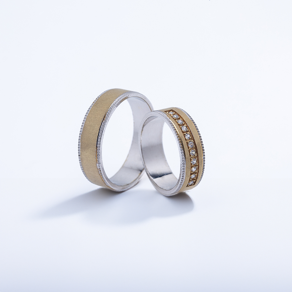 Luksuzan model sa izraženim kontrastom boja. Mat površina od žutog zlata daje sofisticiran izgled, dok beli pojas sa kamenčićima unosi svežinu i svetlucavi efekat. Idealne za parove koji traže burme sa karakterom i elegancijom.