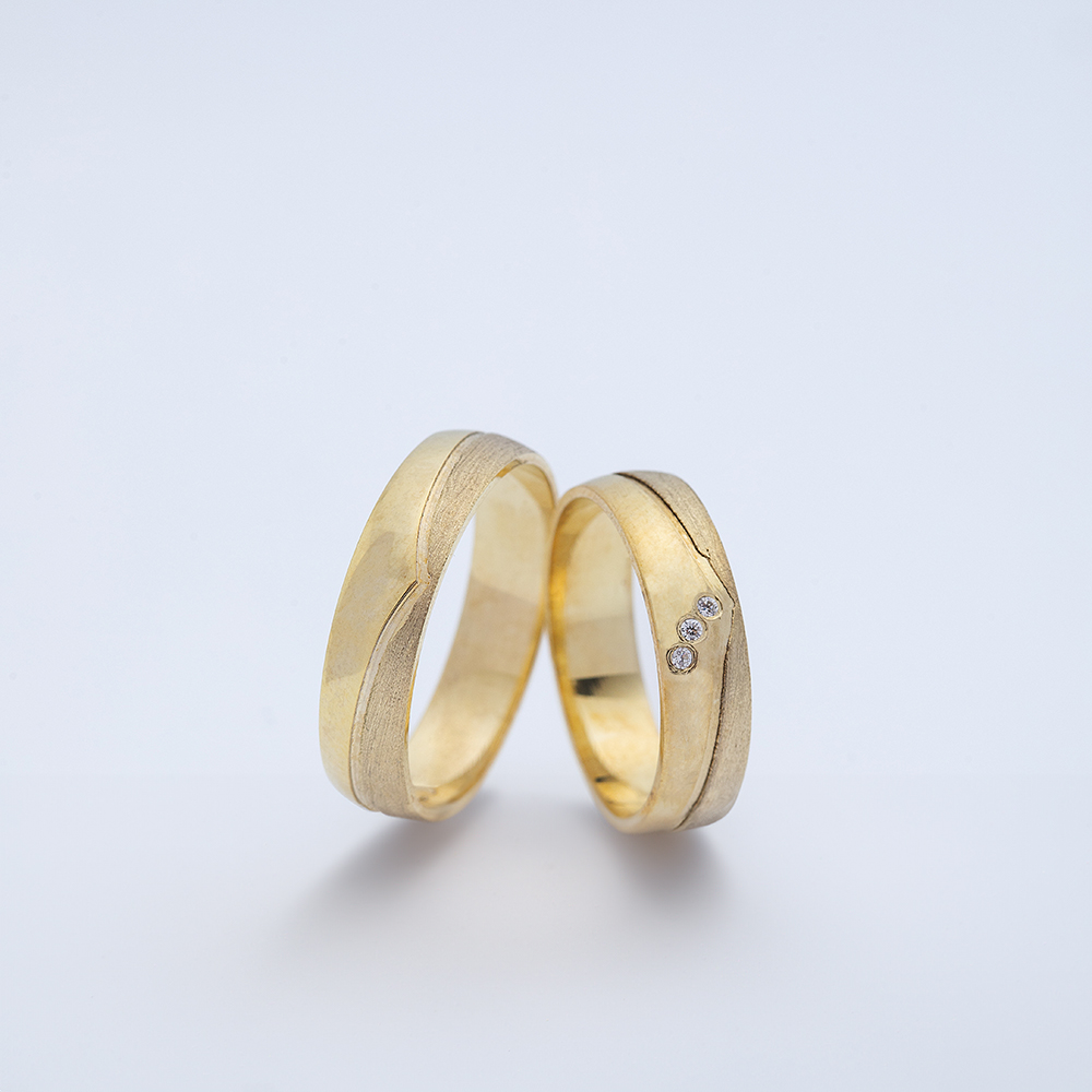 Burme od žutog zlata sa blago talasastom linijom koja deli peskiranu i poliranu površinu. Ženski model krase tri dijamanta.