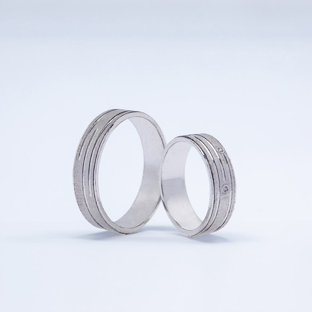 Muška burma ima precizno urezane linije koje stvaraju moderan geometrijski izgled, dok ženska ima dodatno dva sitna kamenčića diskretno uklopljena u linijski motiv.