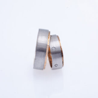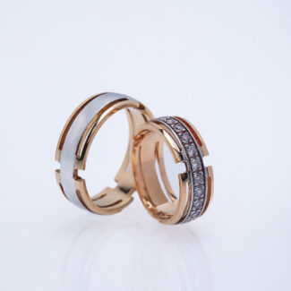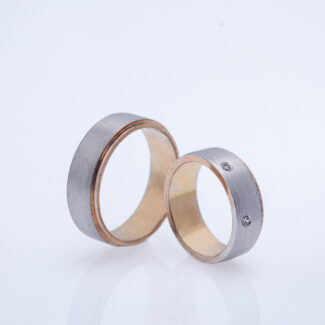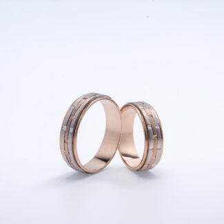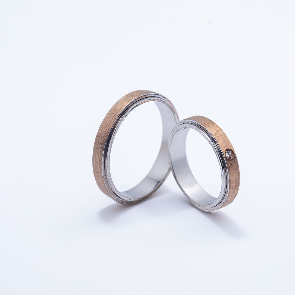 Nežan kontrast roze i belog zlata daje ovim burmama toplu, romantičnu notu. Površina je fino brušena, što im daje prirodan izgled, dok jedan kamenčić na ženskoj dodaje tačku svetlosti i elegancije. Pogodne su za parove koji žele moderan, ali ne previše upadljiv dizajn.