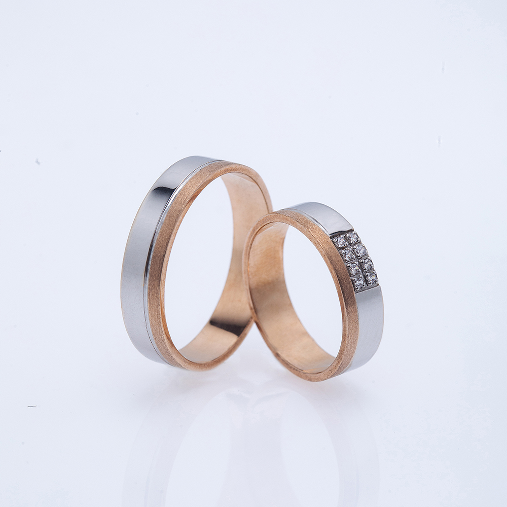 Savršen balans elegancije i jednostavnosti. Muška burma ima blagi kontrast između belog i roze zlata, dok ženska sadrži grupu sitnih kamenčića poređanih u pravougaonu formu. Sofisticiran i čist dizajn, idealan za moderne parove.