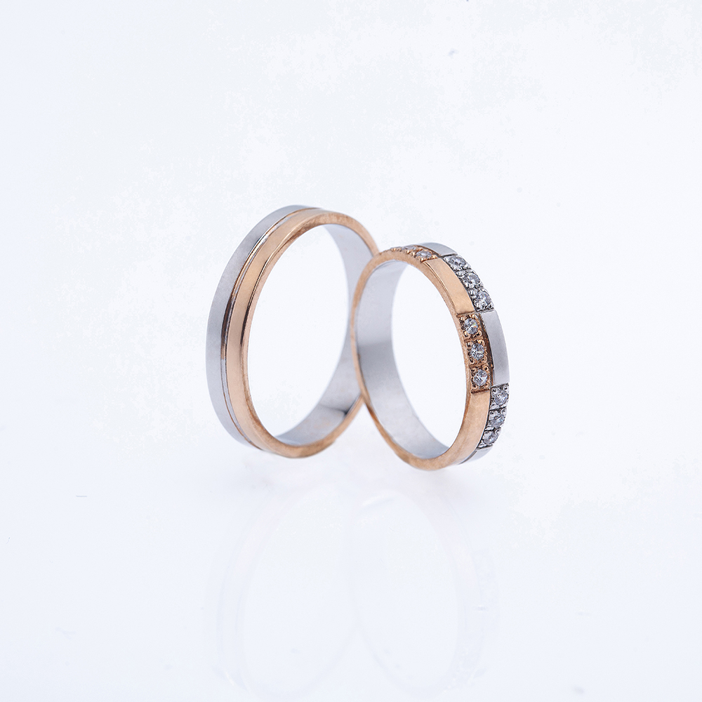 Ove burme spajaju toplinu roze i eleganciju belog zlata. Muška burma je jednostavna i svedena, dok ženska ima red sitnih kamenčića koji blistaju pri svakom pokretu. Odličan izbor za parove koji žele da zadrže klasičan oblik, ali dodaju malo luksuza i modernog sjaja.
