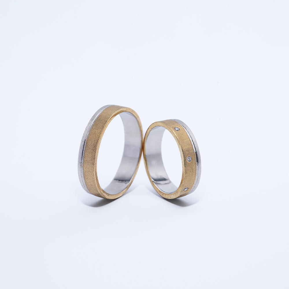 Spoj topline žutog zlata i elegancije belog sa matiranom obradom. Ženska burma ima sitne kamenčiće, dok muška zadržava čistu liniju.