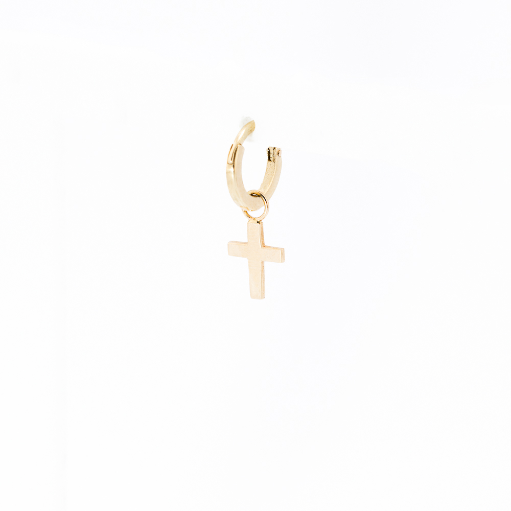 Okrugle zlatne minđuše sa priveskom u obliku krstića odišu svedenom elegancijom. Bez kamenčića, fokus je na čistim linijama i simbolici samog oblika. Izrađene su od 14K zlata, lagane su i udobne za nošenje zahvaljujući zatvaranju na šraf, što ih čini idealnim izborom za svakodnevne kombinacije. Diskretan sjaj zlata i pokret priveska stvaraju suptilan, ali upečatljiv detalj. Dostupne u žutom, belom i roze zlatu.
