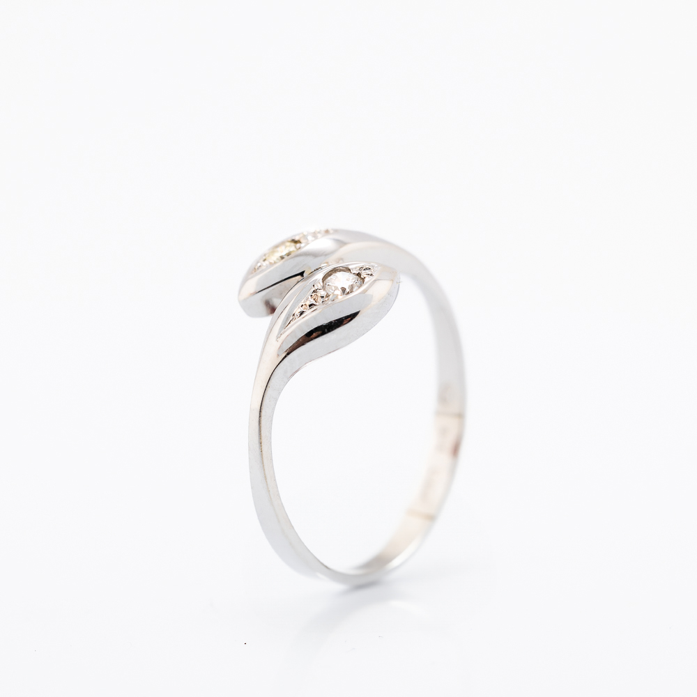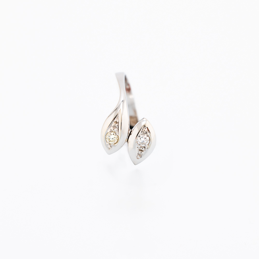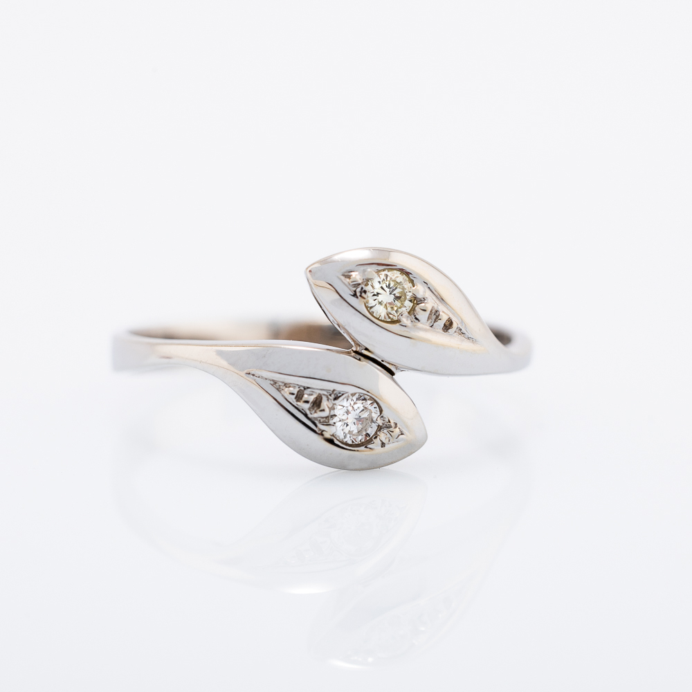 Zlatni prsten od 14K belog zlata sa dvostrukim završetkom u obliku stilizovanih listova, u kojima su ugnježdena dva dijamanta. Oblik simbolizuje sklad i prirodnu eleganciju.