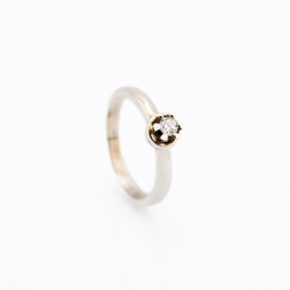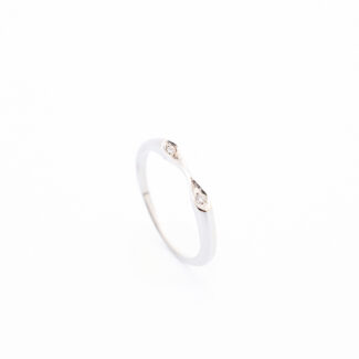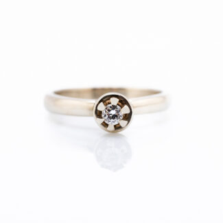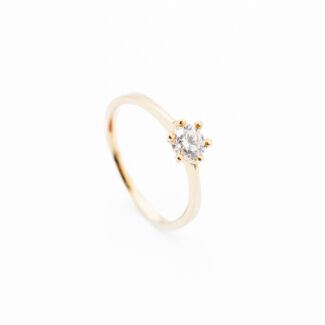 Kada se pogleda sa strane, čini se kao da se niz belih dijamanata ili cirkona nežno “utapa” u zlato, bez oštrih prelaza i bez naglašenih metalnih elemenata. To prstenu daje izuzetno uredan, elegantan karakter, a kamenja prelivaju svetlost ravnomerno, jedno preko drugog, pa se stvara efekat nežnog, neprekidnog sjaja.