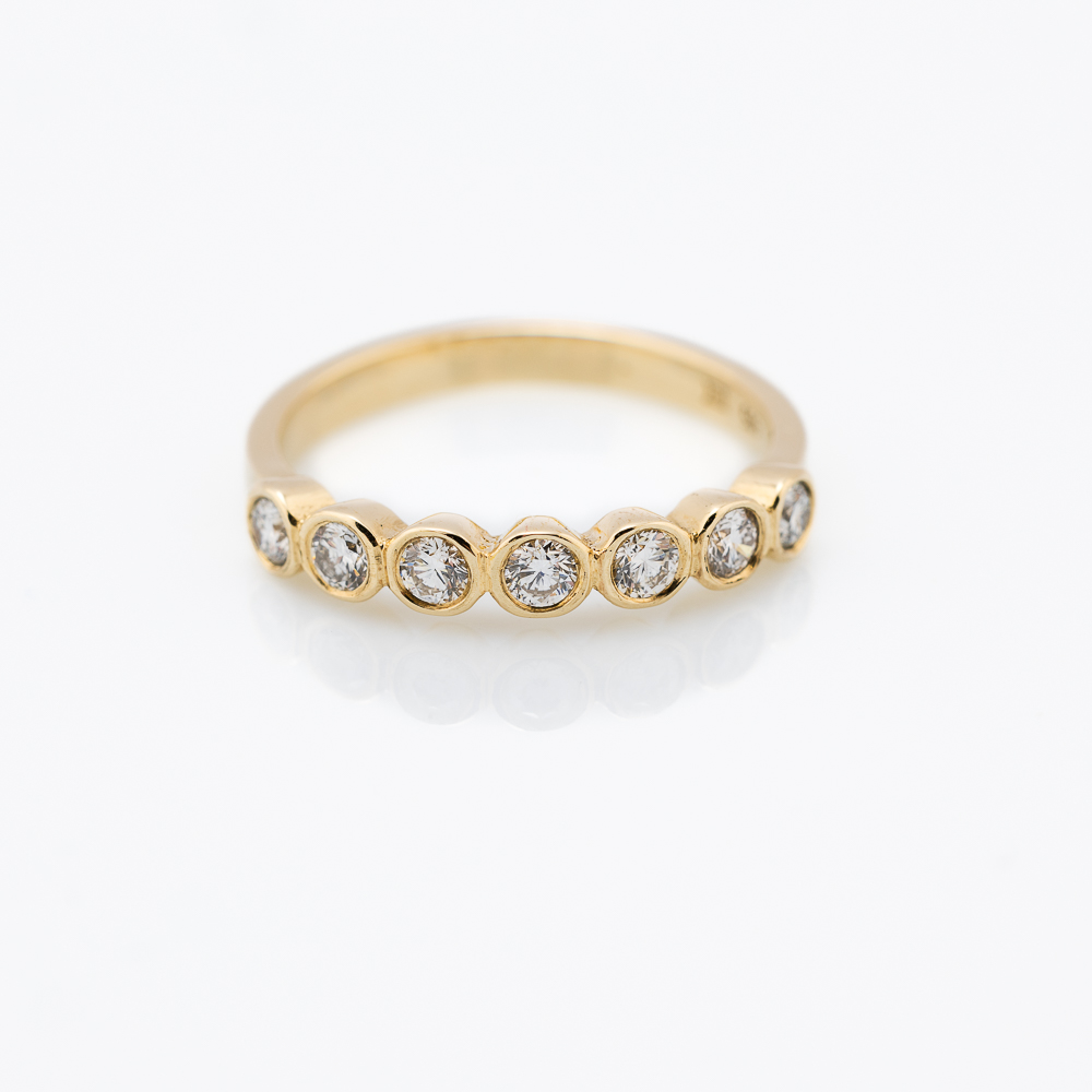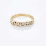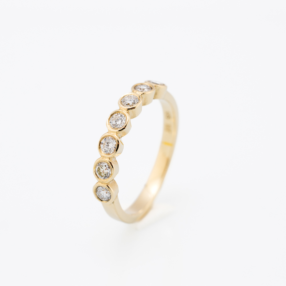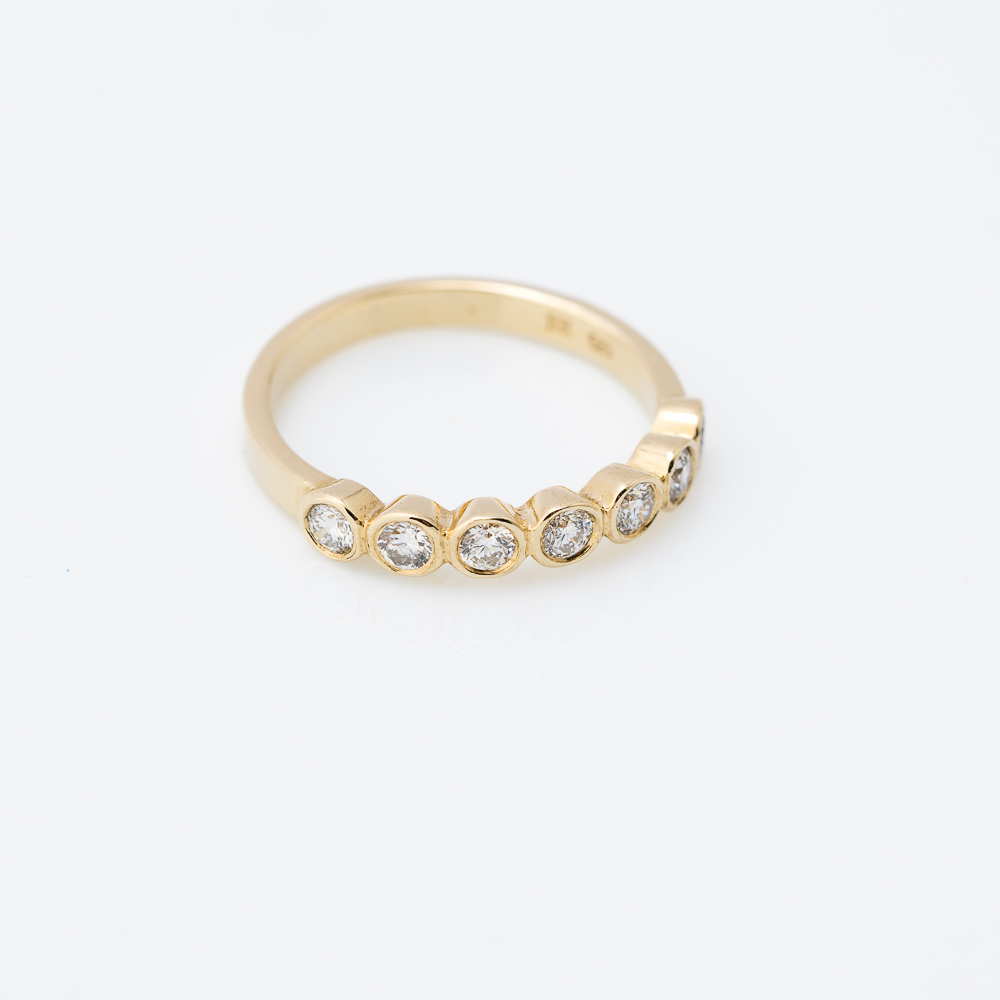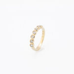 Prsten od žutog zlata sa nizom okruglih belih kamenčića – dijamanti ili cirkoni – postavljenih u pojedinačne bezel okove duž prednjeg dela obruča.