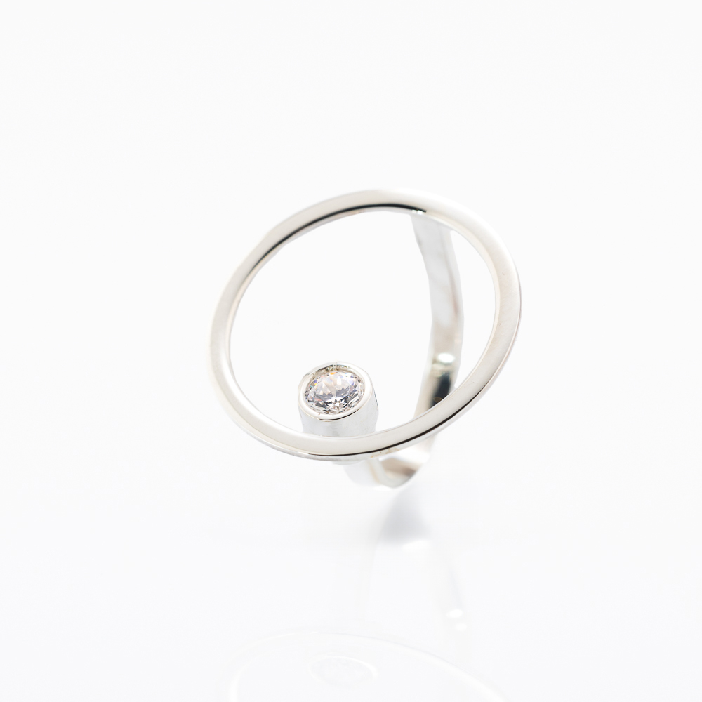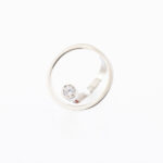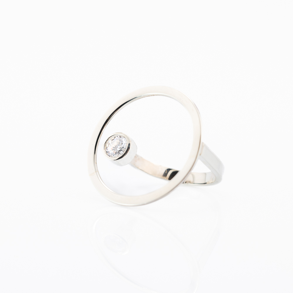Ovaj moderan prsten izrađen je od belog zlata i ima jedinstven, umetnički dizajn sa kružnim okvirom unutar kog se nalazi centralno postavljen dijamant okruglog oblika. Dijamant je udeljen i fiksiran u glatkom, sjajnom ležištu koje naglašava njegovu svetlucavost i jasnoću. Minimalistička forma sa geometrijskim kružnim motivom daje prstenu prepoznatljiv, savremen izgled – elegantan, ali i upečatljiv u isto vreme.