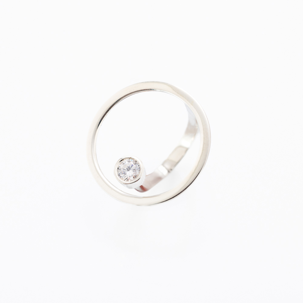 Prsten od belog sa kružnim okvirom i centralno postavljenim dijamantom u glatkom, sjajnom ležištu – moderan, minimalistički i elegantan komad nakita.