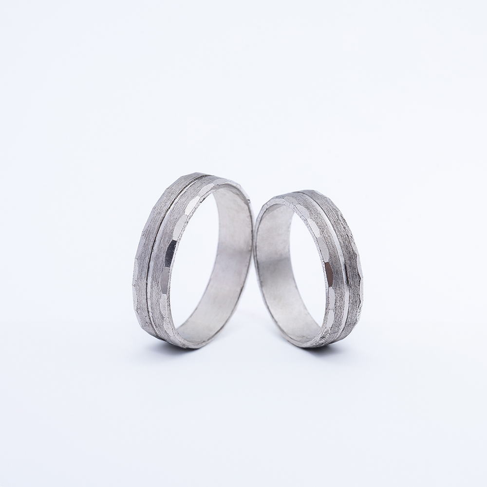 Burme od belog zlata sa ručno facetiranom površinom i centralnim brušenim pojasom.