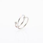 Ovaj prsten izrađen je od belog zlata i ima elegantan spiralni dizajn koji se obavija oko prsta u dva kruga. Na oba kraja spirale nalaze se mali, okrugli dijamanti koji dodaju prstenu suptilan, ali prepoznatljiv sjaj. Njegov minimalistički izgled u kombinaciji sa dinamičnim oblikom čini ga savršenim izborom za svakodnevno nošenje, ali i kao upečatljiv detalj za posebne prilike.