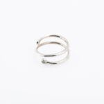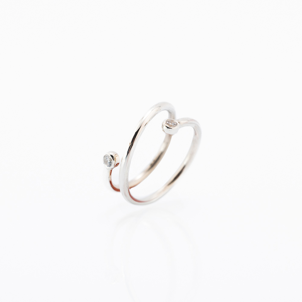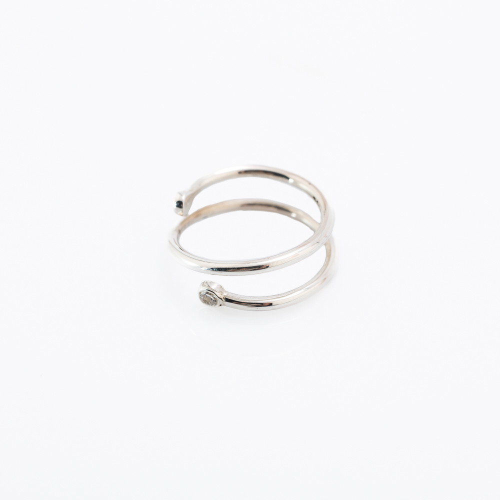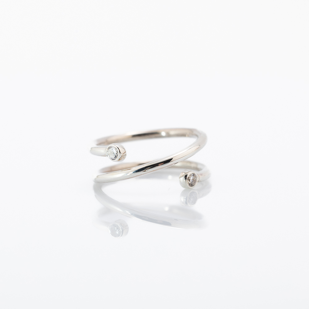 Prsten od belog zlata spiralnog oblika koji se obavija oko prsta, sa po jednim okruglim dijamantom na krajevima.