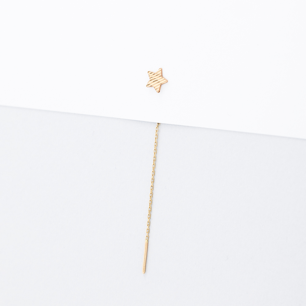 Ove minđuše su mala magija u pokretu – diskretna reljefna zvezdica pri uvetu i tanki lanac koji slobodno visi čine ih idealnim detaljem za svakodnevni stil. Izrađene od 14K zlata, otporne su na habanje i zadržavaju sjaj dugi niz godina. Savršene su za one koji žele suptilan, ali upečatljiv detalj koji ističe vrat i dekolte, a može se kombinovati sa drugim nakitom ili nositi samostalno.