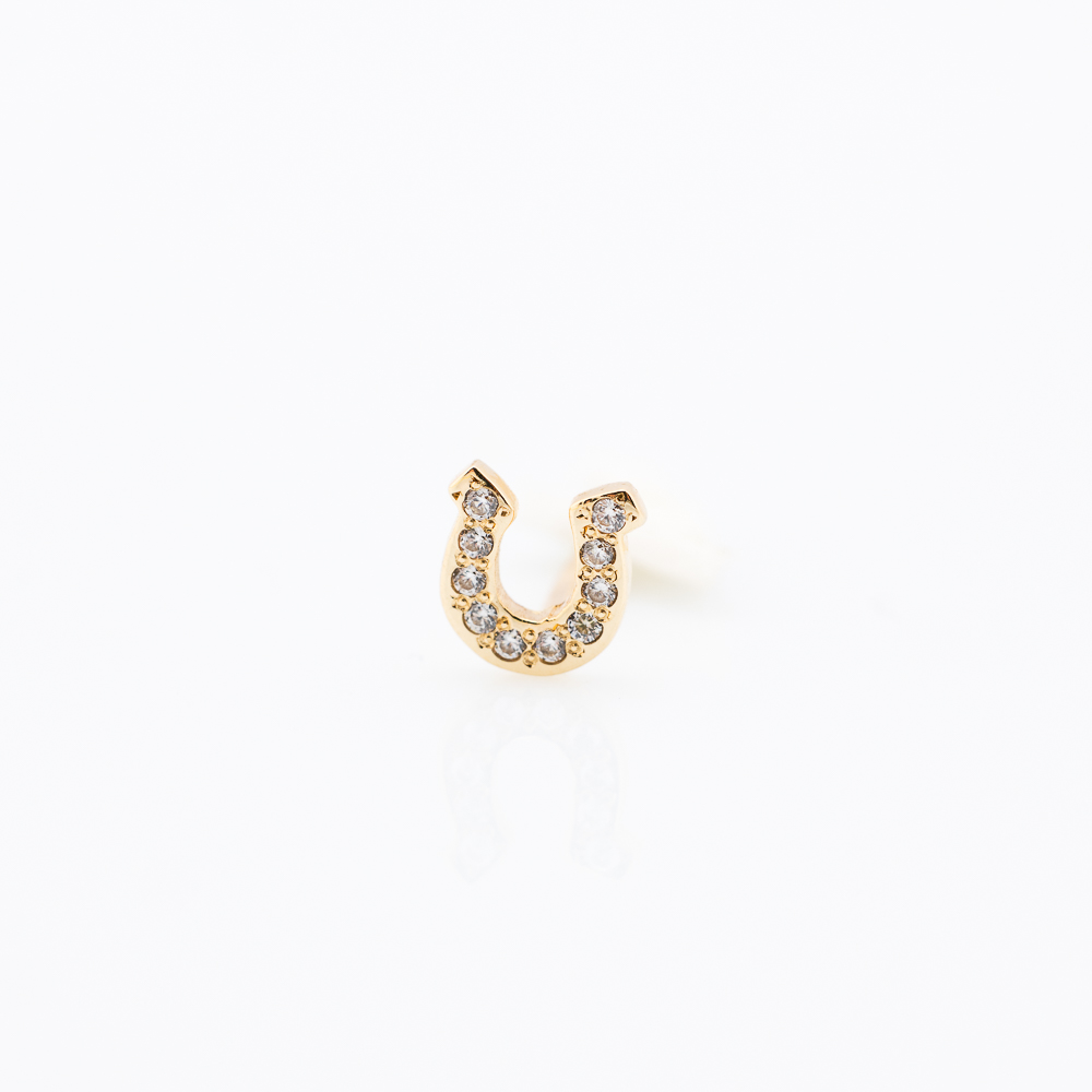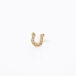 Minđuša od žutog zlata na šraf u obliku potkovice ukrašene nizom malih kamenčića.