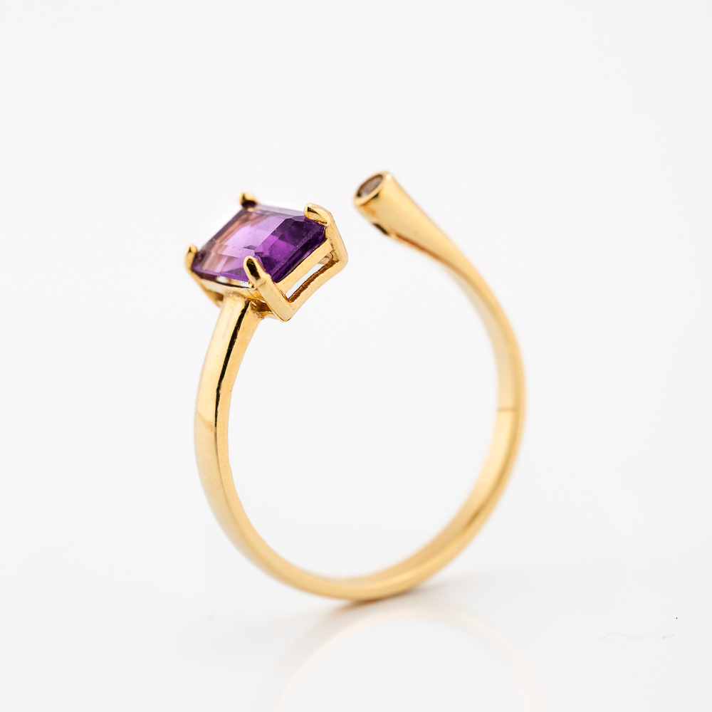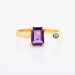 Zlatni prsten izrađen od 14K žutog zlata sa ametistom pravougaonog “emerald cut” brušenja i malim dijamantom postavljenim naspram njega u otvorenom dizajnu. Kombinacija duhovne smirenosti i luksuza.