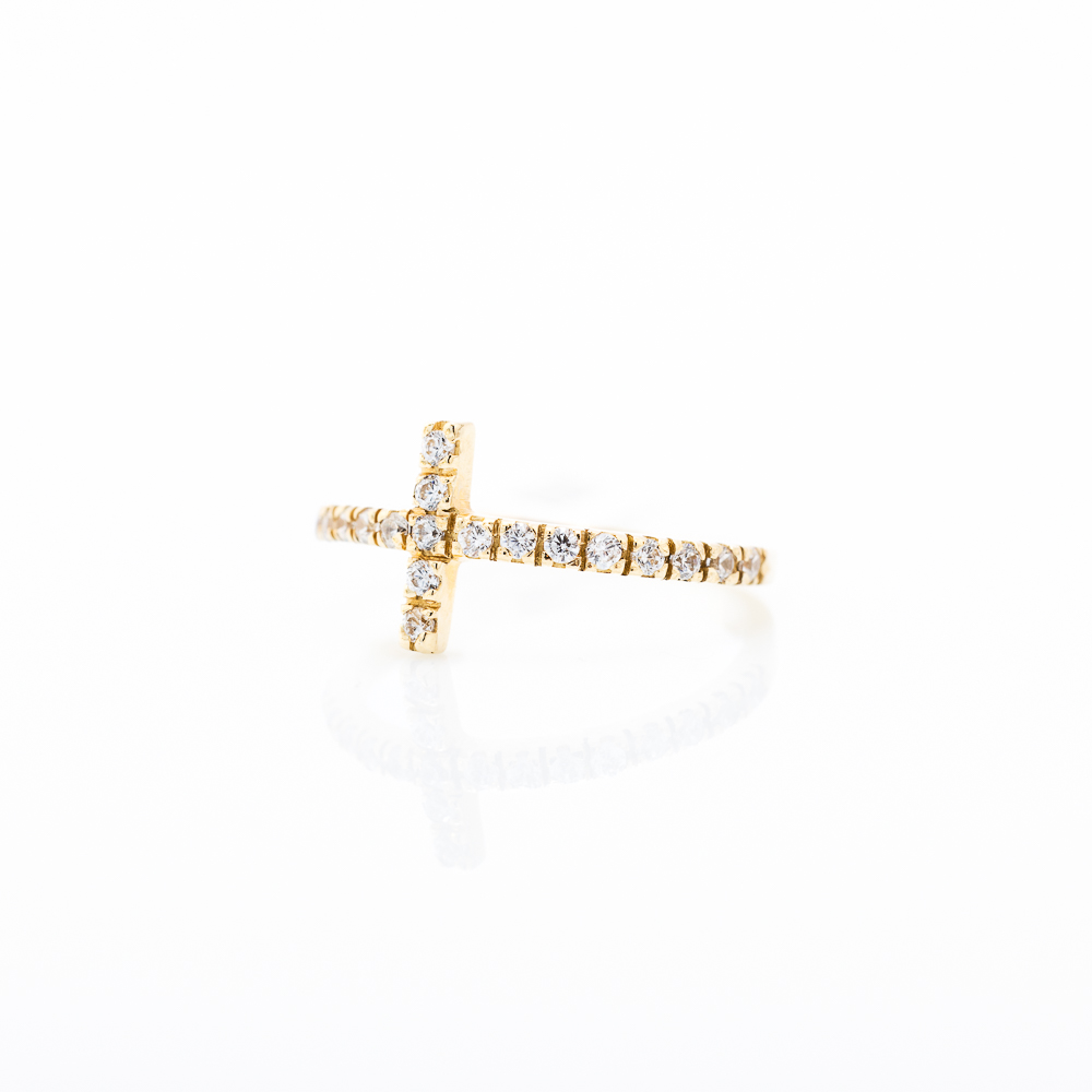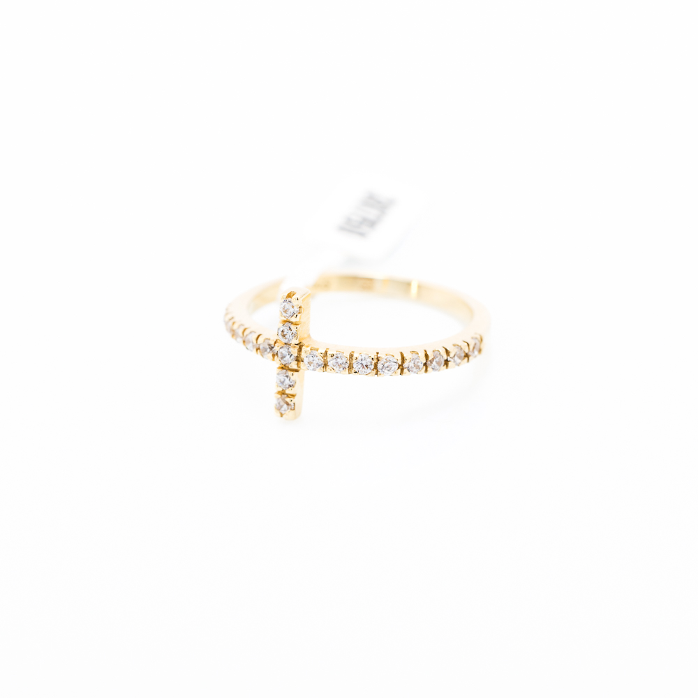Zlatni prsten od 14K žutog zlata sa pažljivo urezanim dijamantima raspoređenim u obliku krsta na gornjoj strani prstena. Dijamanti su postavljeni u pavé stilu, formirajući horizontalnu i vertikalnu liniju koje se seku pod pravim uglom, stvarajući prefinjen i svetlucav krst. Ovaj model namenjen je ženama koje vole elegantan nakit sa značenjem – simbolizuje veru, zaštitu i unutrašnju snagu, dok toplina žutog zlata i sjaj dijamanata naglašavaju sofisticiranost i svakodnevnu eleganciju.