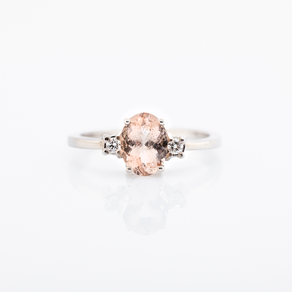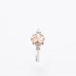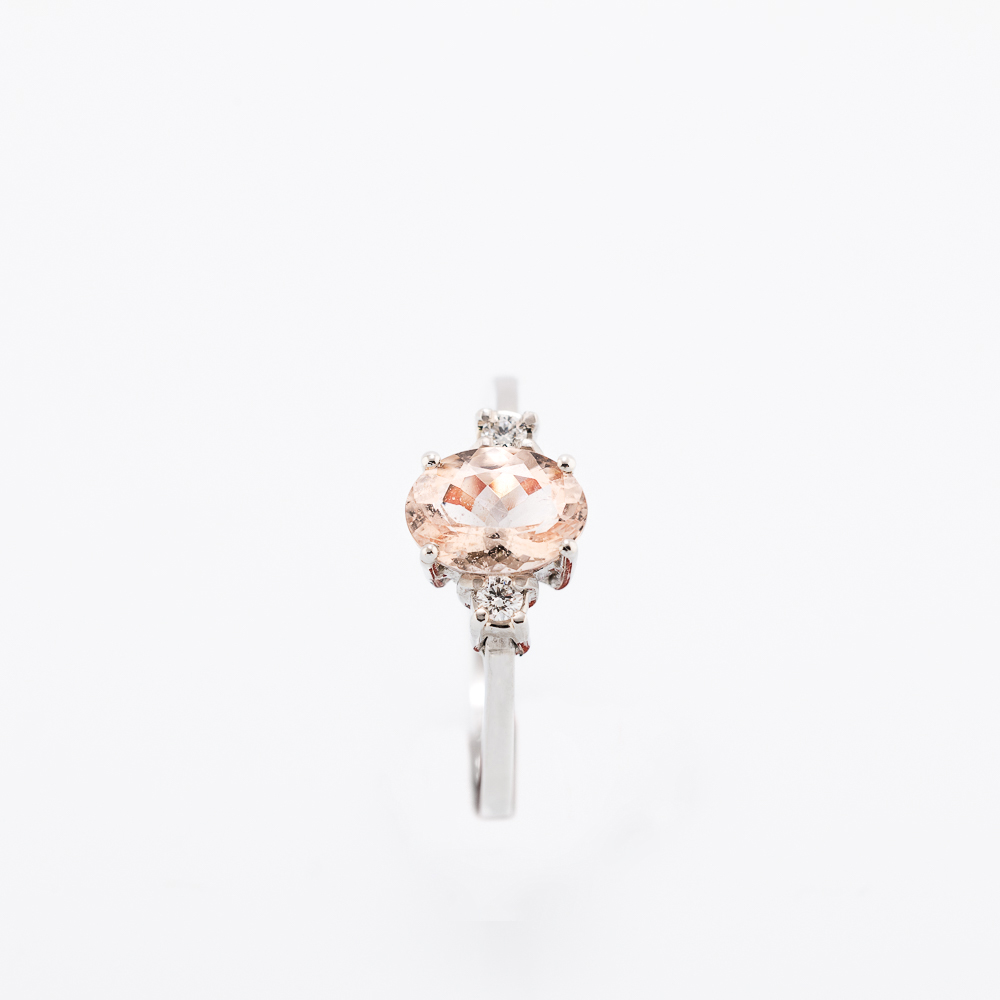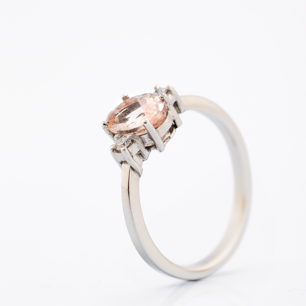 Zlatni prsten od 14K belog zlata sa centralnim breskva (morganit) kamenom ovalnog sečenja i bočnim dijamantnim akcentima. Topao ton kamena daje romantičan i nežan izgled.