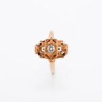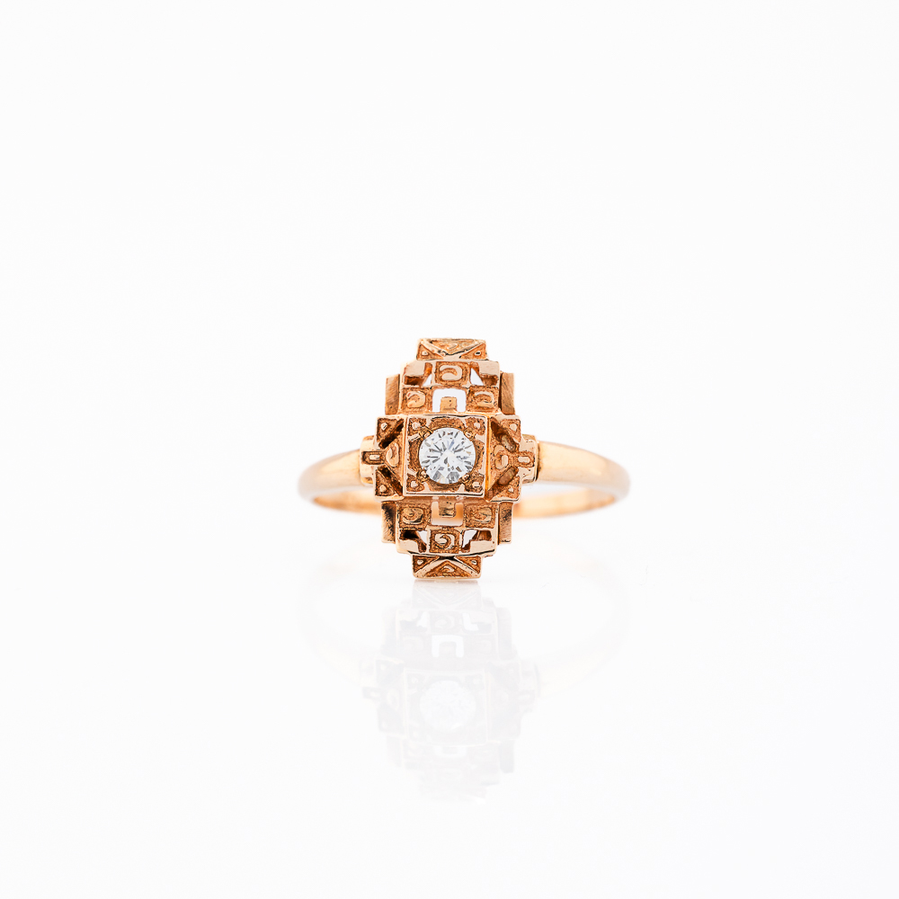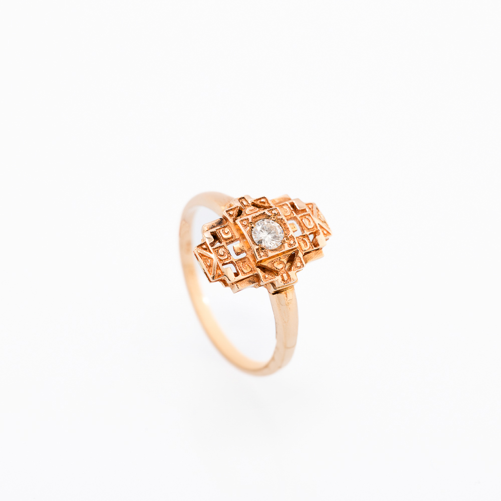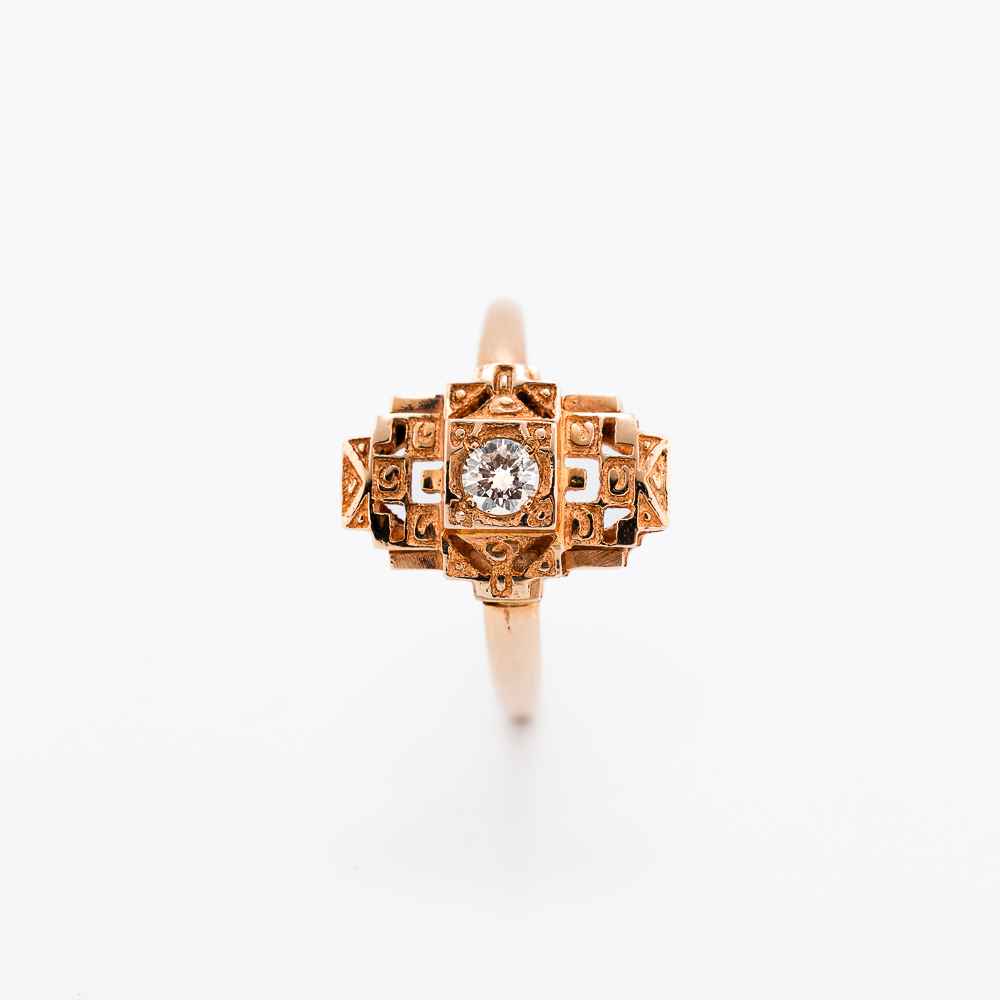 Zlatni prsten od 14K roze zlata sa centralnim koralnim kamenom u dekorativnom geometrijskom okovu. Masivan i izražajan komad nakita inspirisan retro stilom.