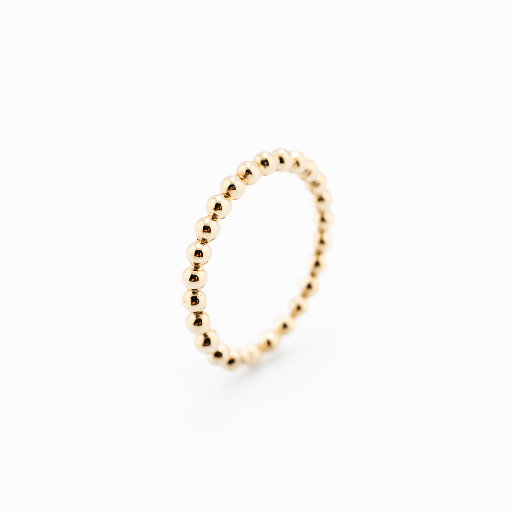 Zlatni prsten od 14K žutog zlata sa obručem sastavljenim od sitnih, poliranih kuglica koje daju trodimenzionalnu teksturu i refleks svetlosti. Minimalistički i moderan dodatak svakom stilu.
