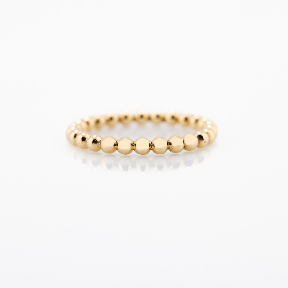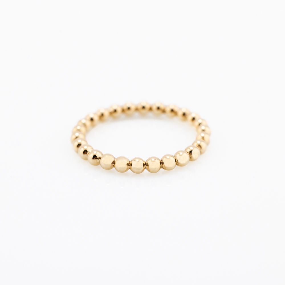 Zlatni prsten od 14k žutog zlata sa obručem od sitnih poliranih kuglica koje reflektuju svetlost.