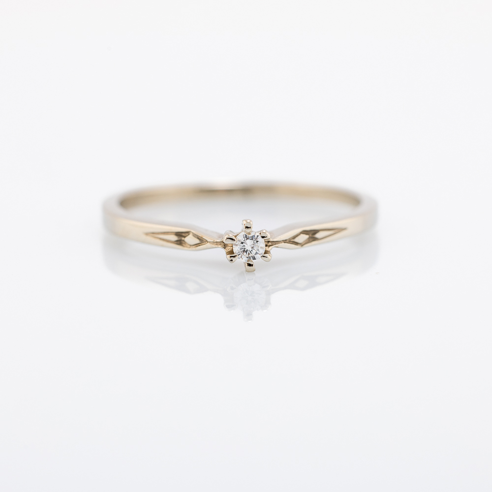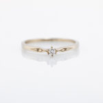 Zlatni prsten izrađen od 14K žutog zlata sa dijamantom u obliku marquise brušenja, postavljenim u dekorativni otvoreni okov. Izduženi oblik kamena vizuelno izdužuje prste i daje sofisticiran izgled.