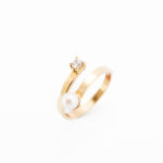 Zlatni prsten sa otvorenim krajevima, biserom i dijamantom – moderan dizajn koji spaja nežnost i luksuz.