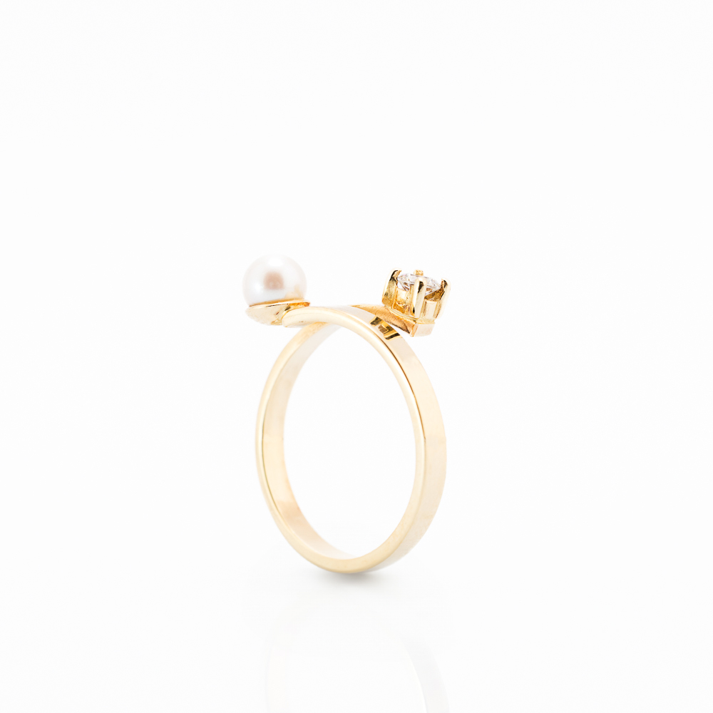 Ovaj prsten od žutog zlata odlikuje se modernim i umetničkim dizajnom sa otvorenim krajevima. Na jednom kraju nalazi se bela biserna kuglica, dok je na drugom postavljen briljantno sečeni providni kamen u klasičnom okovu. Kombinacija bisera i dijamanta stvara zanimljiv kontrast između mekog, mat sjaja bisera i blistavog odsjaja kamena. Dizajn je minimalistički, ali upečatljiv – savršen za one koji vole spoj elegancije i savremene estetike.