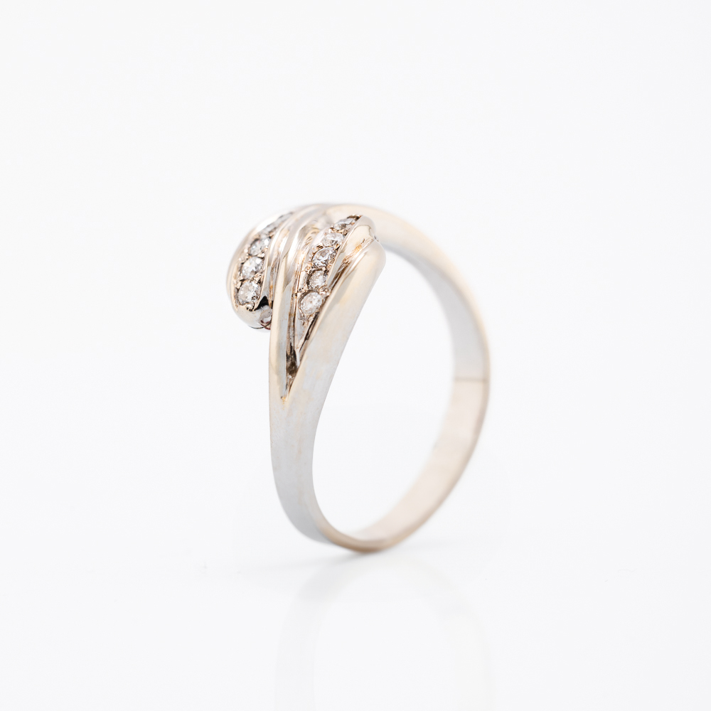 Zlatni prsten izrađen od 14K žutog zlata sa dvostrukim uvijenim obručem koji formira elegantne linije u kojima su pavé postavljeni dijamanti. Simbol večne povezanosti i harmonije.