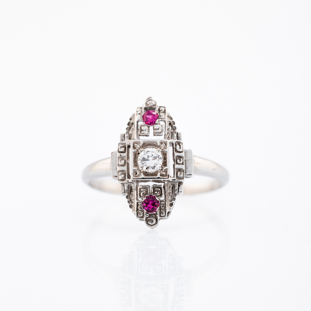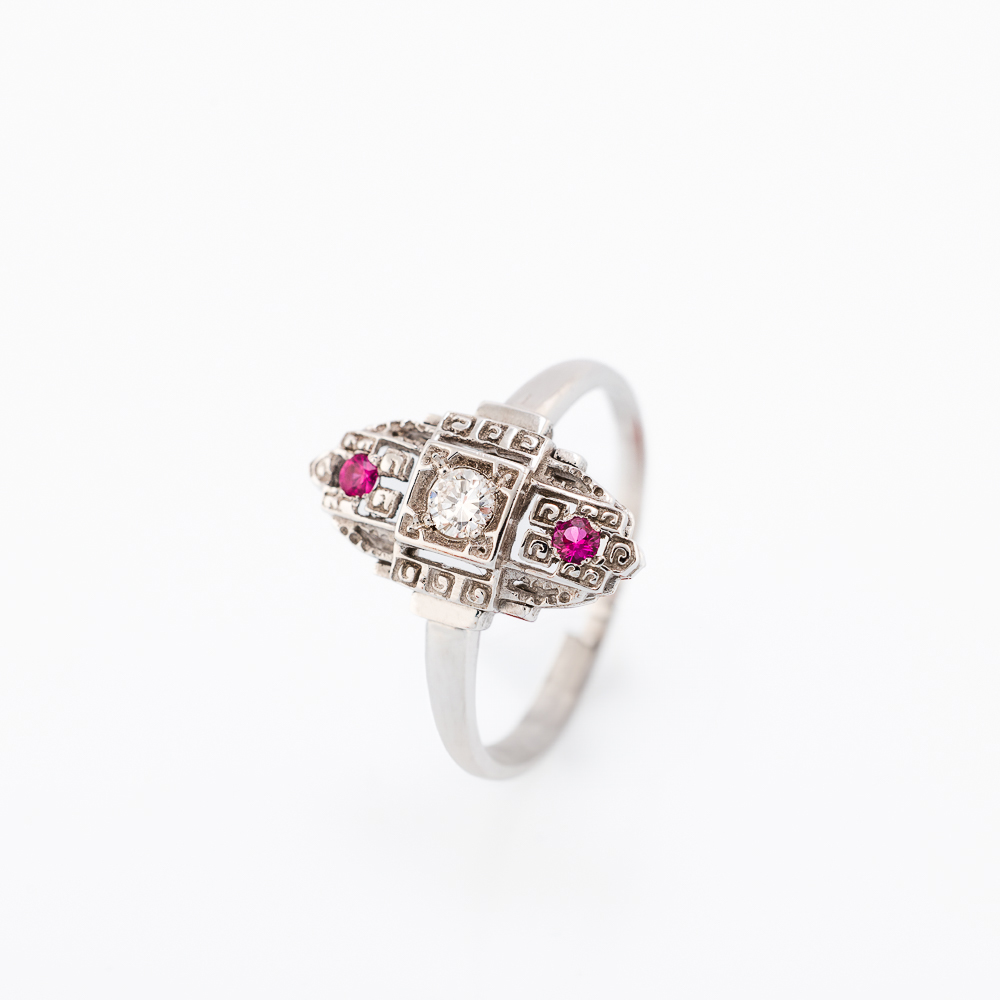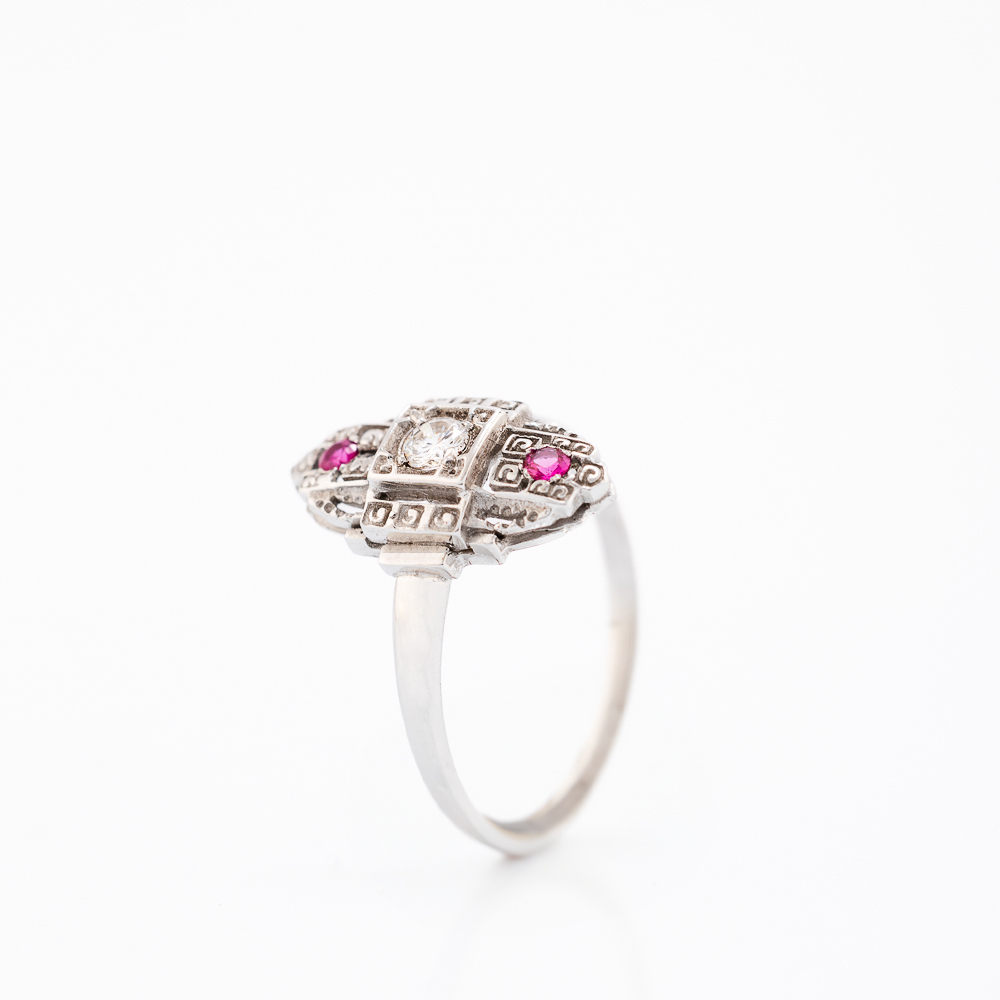 Zlatni prsten od 14K belog zlata sa centralnim dijamantom i dva rubina raspoređena iznad i ispod njega. Dekorativni gravirani okvir daje mu retro-art karakter.